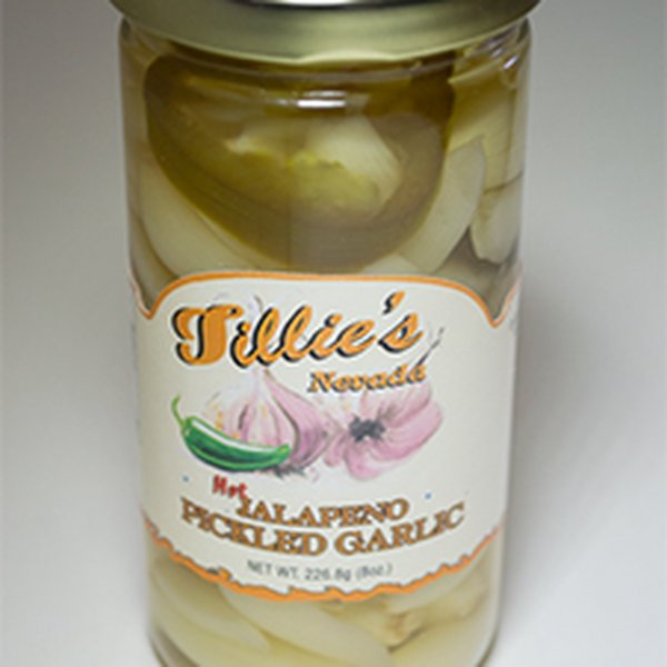 The garlic cloves are never blanched or cooked to insure a crunchy texture. Pickled Jalapeno slices are hand placed...
