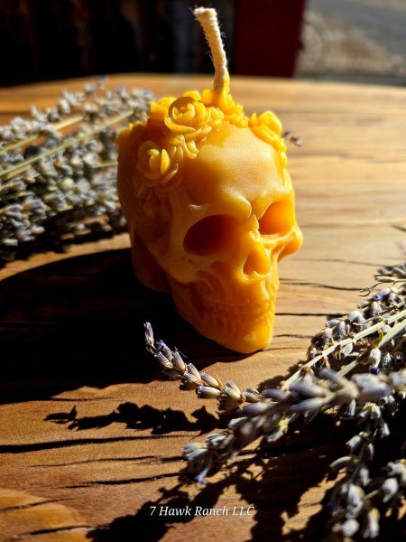 A striking pure beeswax candle featuring an intricately sculpted skull crowned with roses. Poured from naturally...