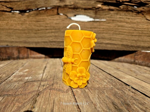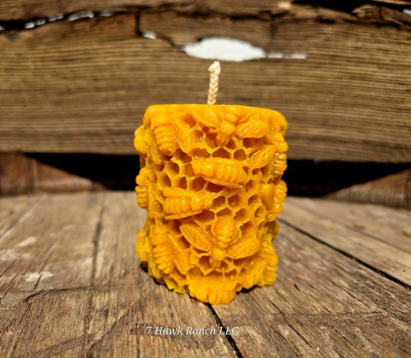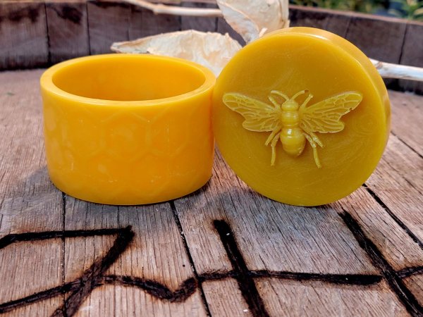 A truly unique pure beeswax jar, beautifully detailed with a honeybee perched on the lid and hexagonal honeycomb...