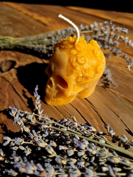 A striking pure beeswax candle featuring an intricately sculpted skull crowned with roses. Poured from naturally aromatic, golden beeswax, it burns with a bright, steady flame that brings warmth and clarity to any space. A beautiful piece for those who love symbolic art - prefect for attracting positive energy and adding beauty to the home.